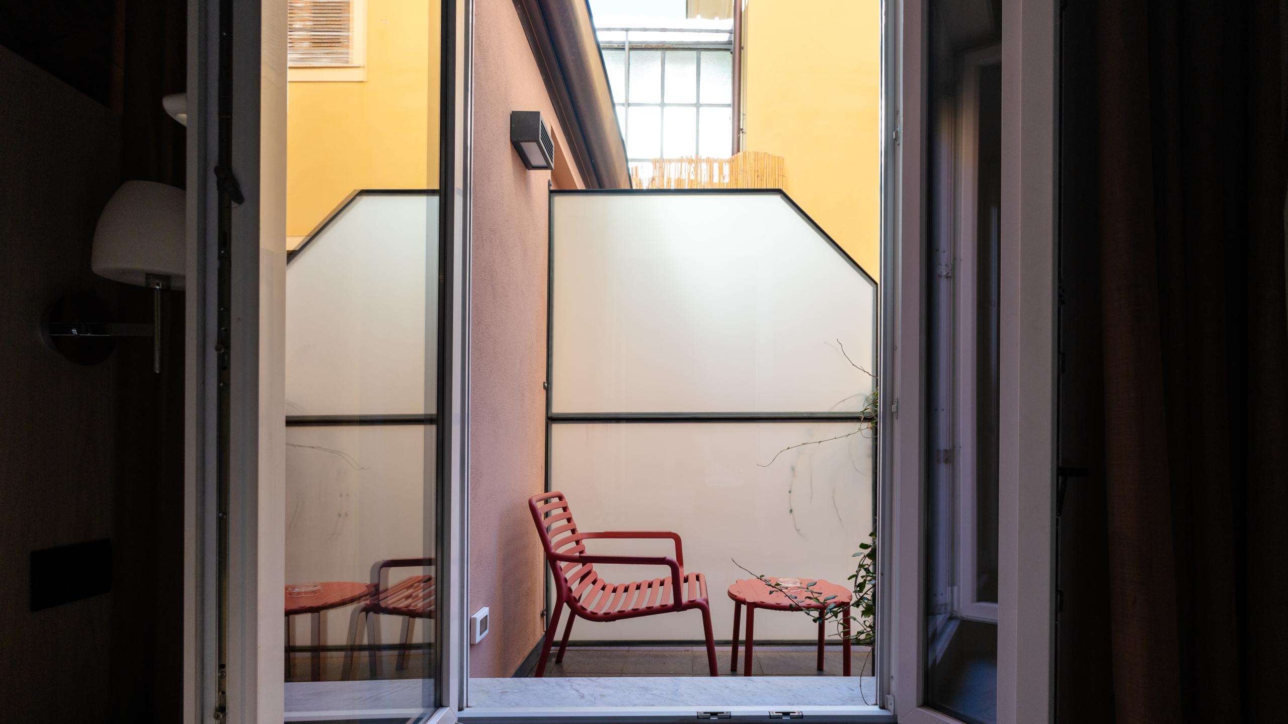Il balconcino privato, affacciato sull’ingresso dell’hotel, aggiunge un piacevole spazio esterno alla camera.